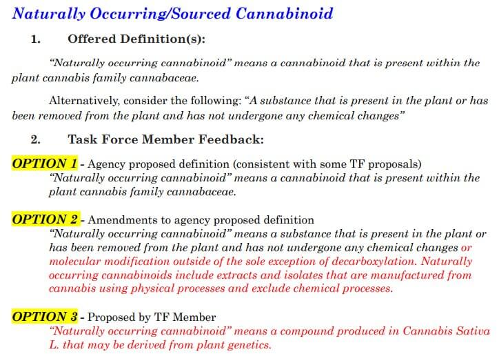 Naturally Occurring Cannabinoid may have been the most contentious term that was discussed during this meeting. Kazmira proposed the red language in option 2 and believes that due to the focus on public safety, the route of how something is manufactured should be the aim here, lending to option 2 being the most viable. One opposing position suggested that the compounds don’t need to be naturally extracted from the plant, but can be found to occur naturally, no matter at what levels. A tiered system was suggested to include the terms naturally occurring (extracted from the plant), naturally occurring/chemically modified (D8 from CBD), and naturally occurring/synthetically derived (mimicking what we find in nature but not naturally in the plant). The issue with the proposed tiered terms above is that it can lead to mass confusion for the consumer, which in turn can lead to major safety concerns.