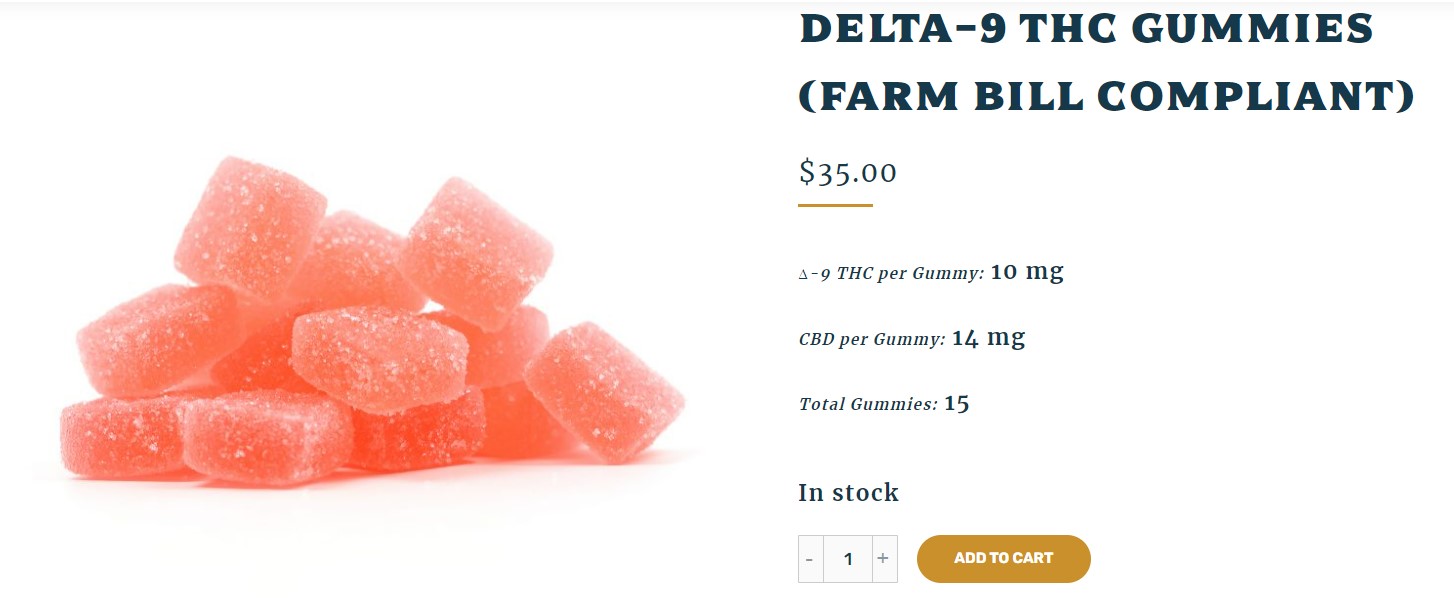 As you can see, this company is blantately taking advantage of the Farm Bill. Each gummy is 5 grams which equates to 5,000 mg total weight. In the context of the THC regulation of .3% dry weight, a 5,000 mg gummy could contain up to 15 mg THC. The gummies above contain 10 mg Delta-9 THC, so technically it is within the legal bounds of the Farm Bill.