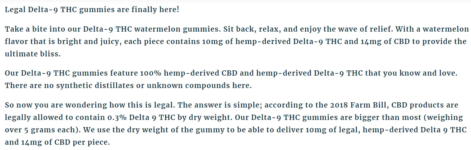 This company even goes as far as explaining the legal hopscotch they play to be “Farm Bill compliant”. This example represents a trend of companies using the dry weight of edible products to their advantage and including as much THC as possible so they can be marketed as a hemp-derived THC product.