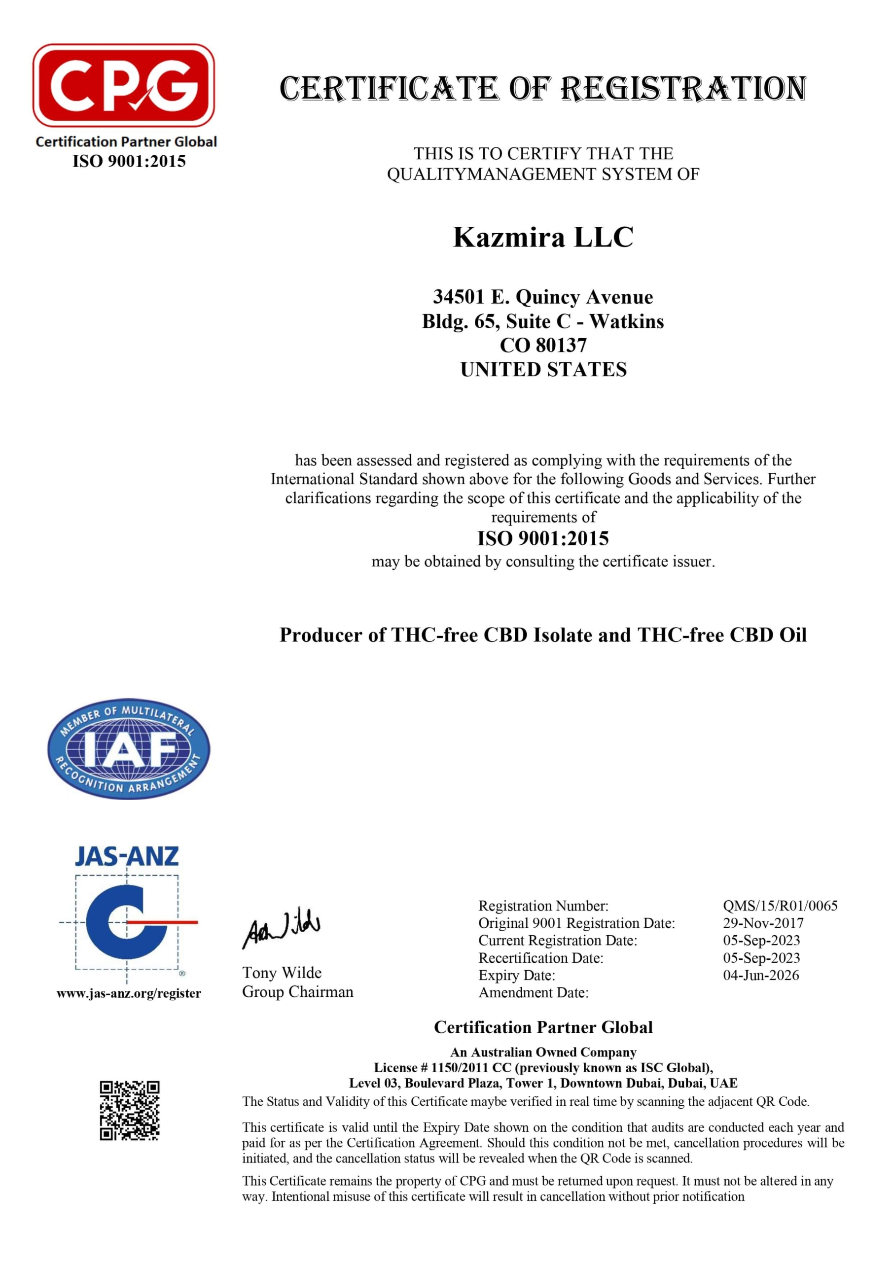 We are extremely proud to be the only manufacturer and wholesaler in the cannabis industry that can claim we are ISO 9001:2015 certified. ISO 9001 is an internationally recognized quality management system that is focused on making sure businesses deliver consistent quality to their clients. We are the ONLY industrial hemp processing company for manufacturing and wholesaling CBD that is ISO certified in the world.